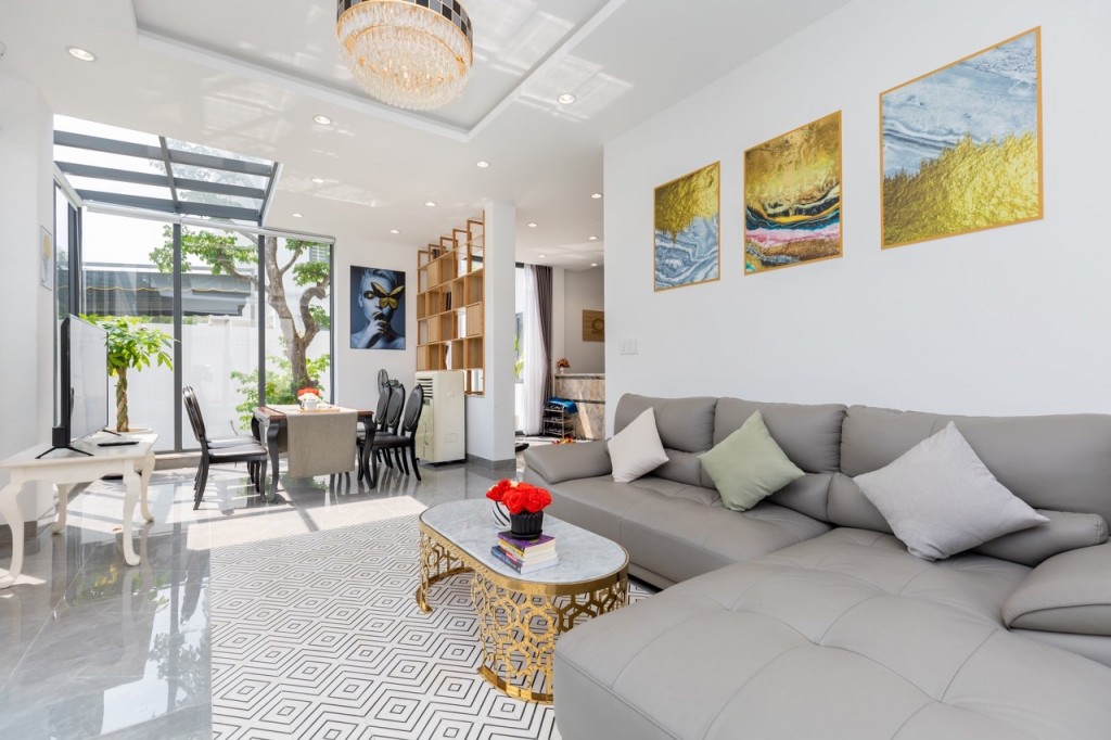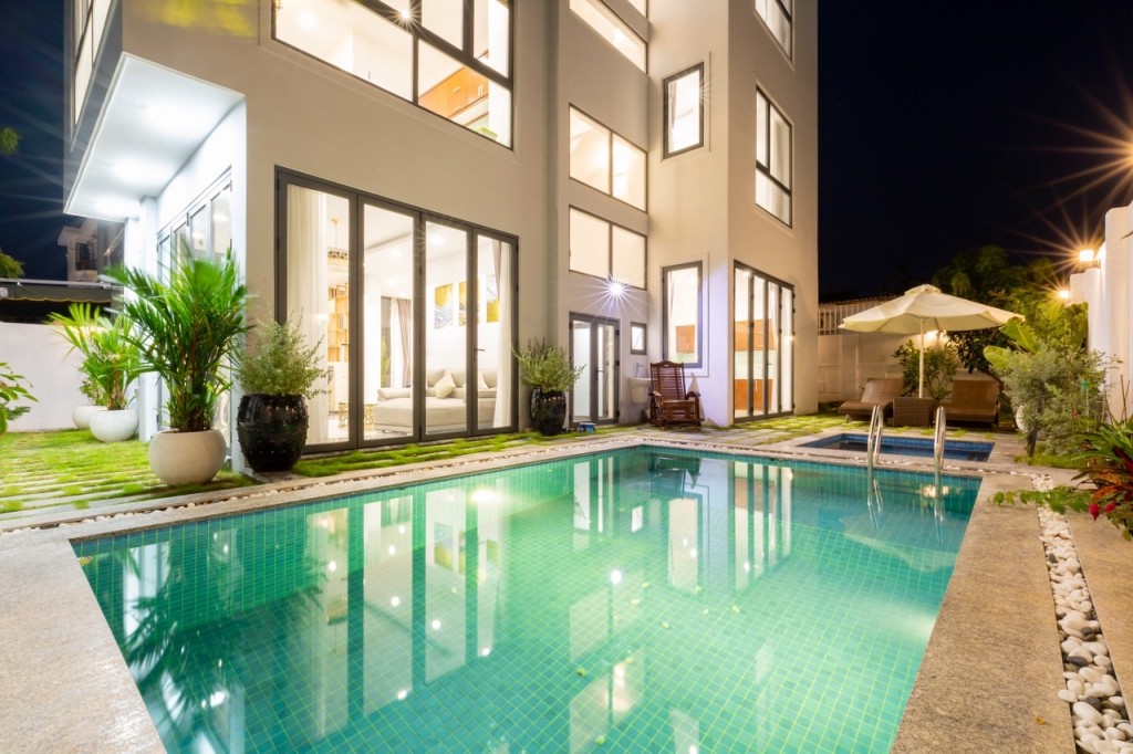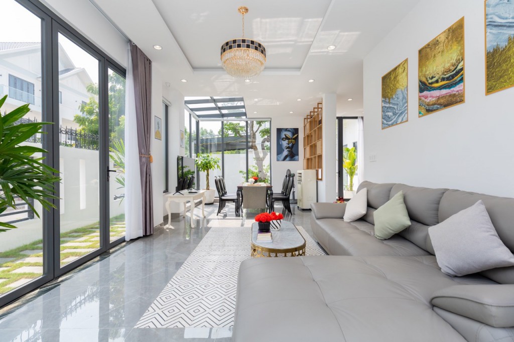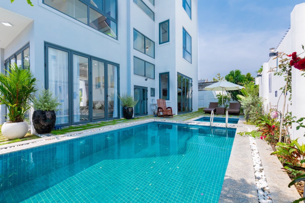 có sân vườn rộng thoáng, có kiểu dáng và thiết kế nội thất đơn giản nhưng chất lượng và đặc biệt là có hồ bơi uốn lượn ngay trước cửa nhà.